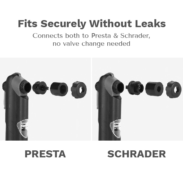 ✔️ EASY TO USE — No hose needed to connect to the tire. Works with both Presta and Schrader tire valves – with a quick flip of the valve (no additional tools required) you can adapt to both types of tires.