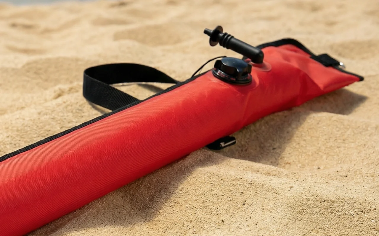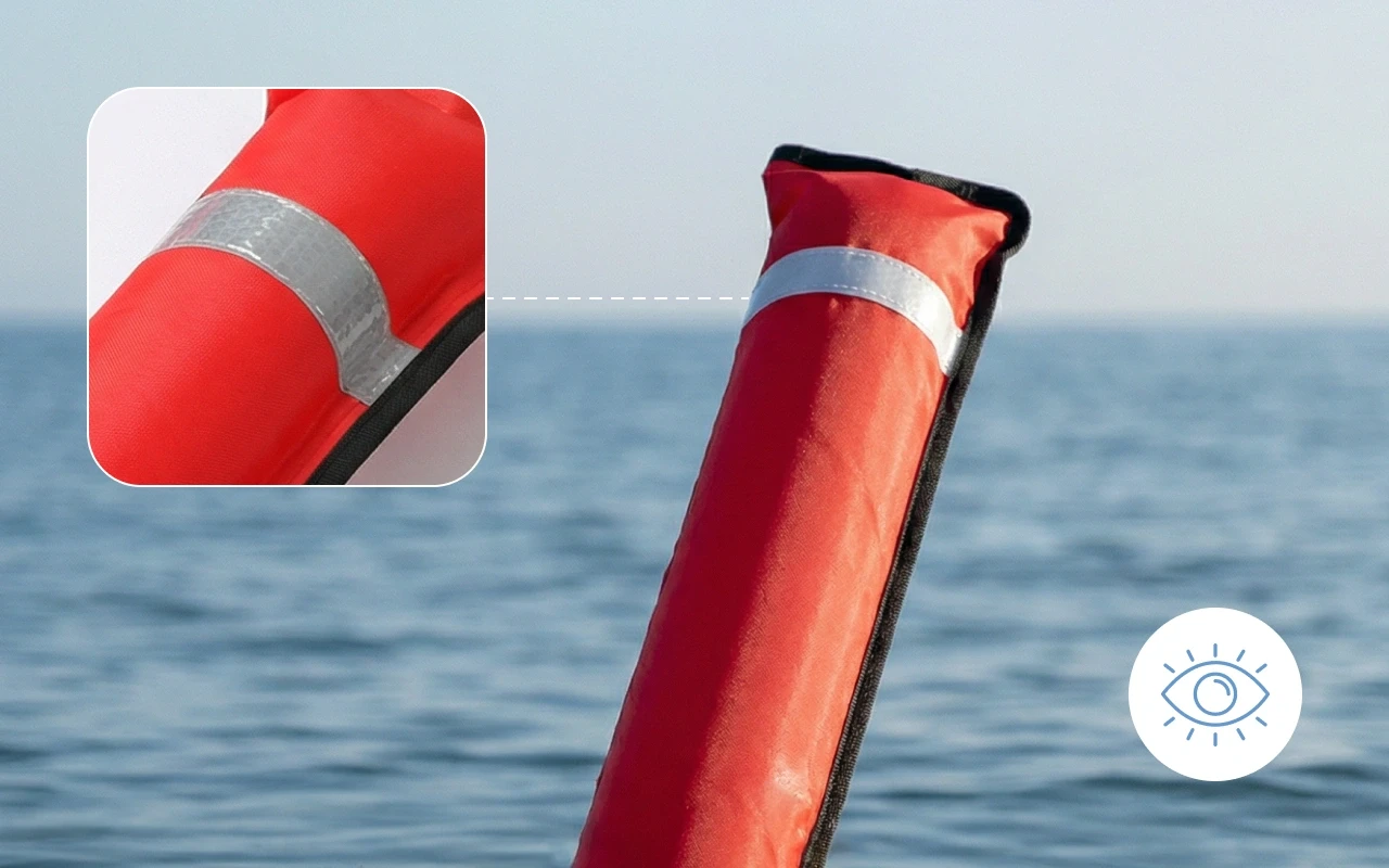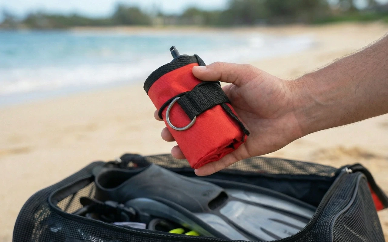 This marker buoy folds up neatly and fits in your bag or pocket. Quick setup lets you focus on enjoying your dive safely.