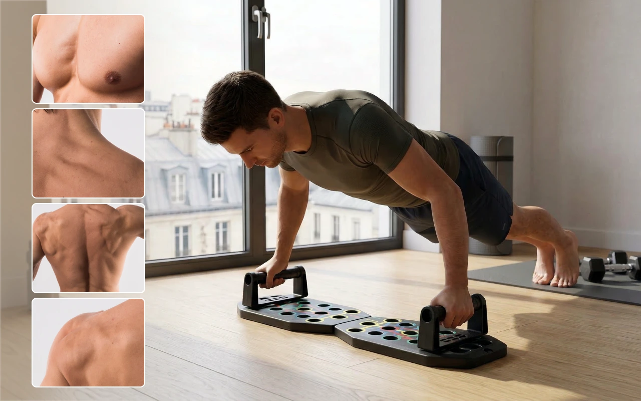 Bought this foldable board so I can train before work. Colour spots make hand placement simple, and my chest and triceps feel worked every session.