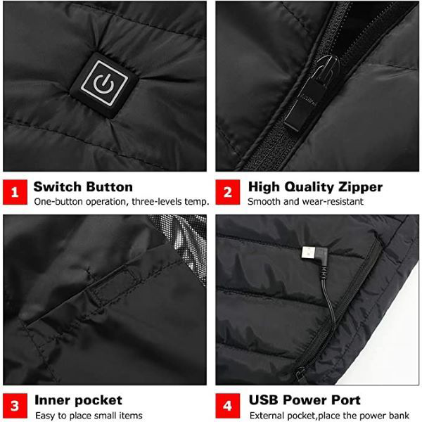 NOTE: This heated vest only can be connected with a removable power bank, with no power adapter connecting. You need to fully charge your removable power bank firstly, then connect with the heated vest. When the power bank is disconnected, the heating vest will also stop working. Power bank not included*