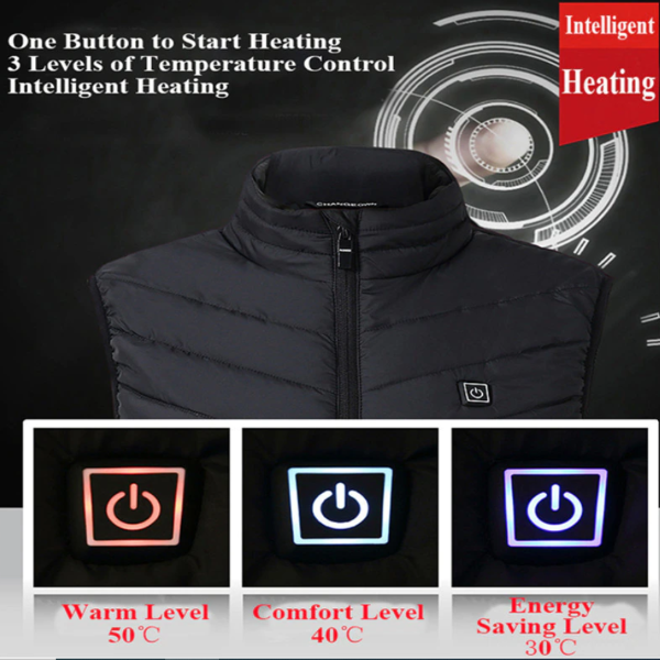 Using our vest is simple and safe. It doesn’t use IR, UV, or other potentially harmful rays but has a special lining to keep the heat from escaping, preventing overheating. If the temperature is too high, it will automatically reduce the temperature to ensure your safety. Moreover, our vest features an effortless button control on the chest. It allows you to adjust the temperature in three levels (30°C/40°C/50°C) as the weather changes.