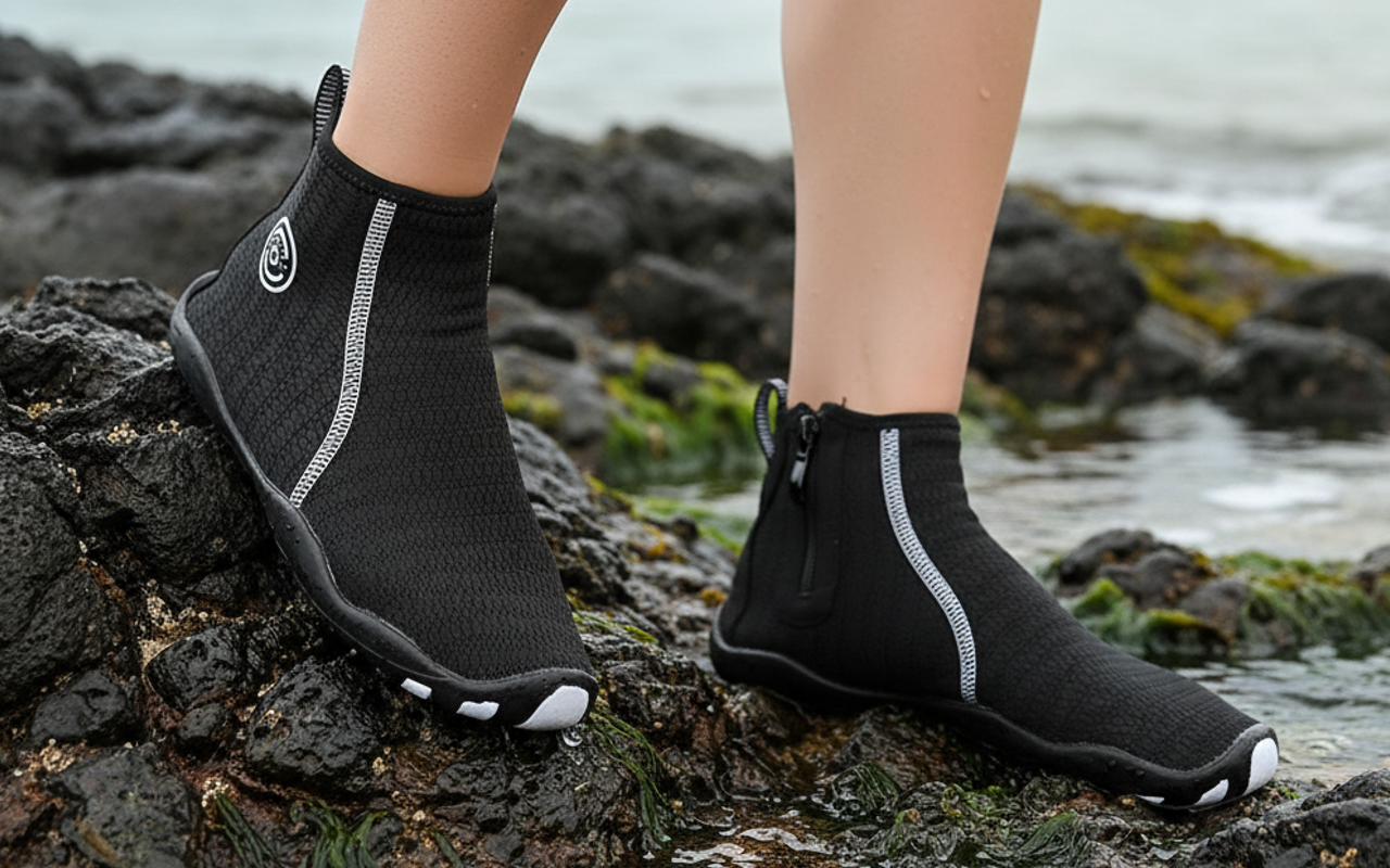 High tops shield ankles from sharp rocks and hot sand. Durable soles reduce slips, giving steady balance on wet or rough ground.