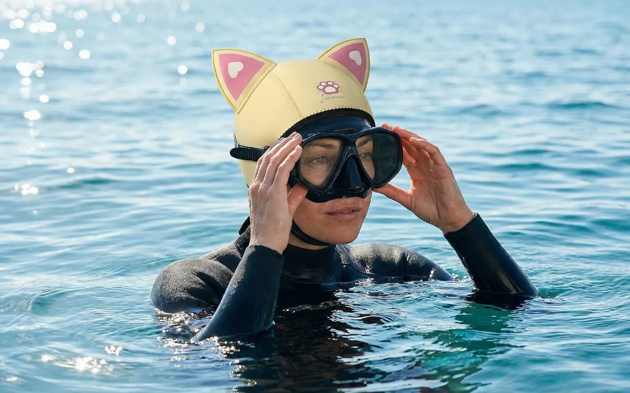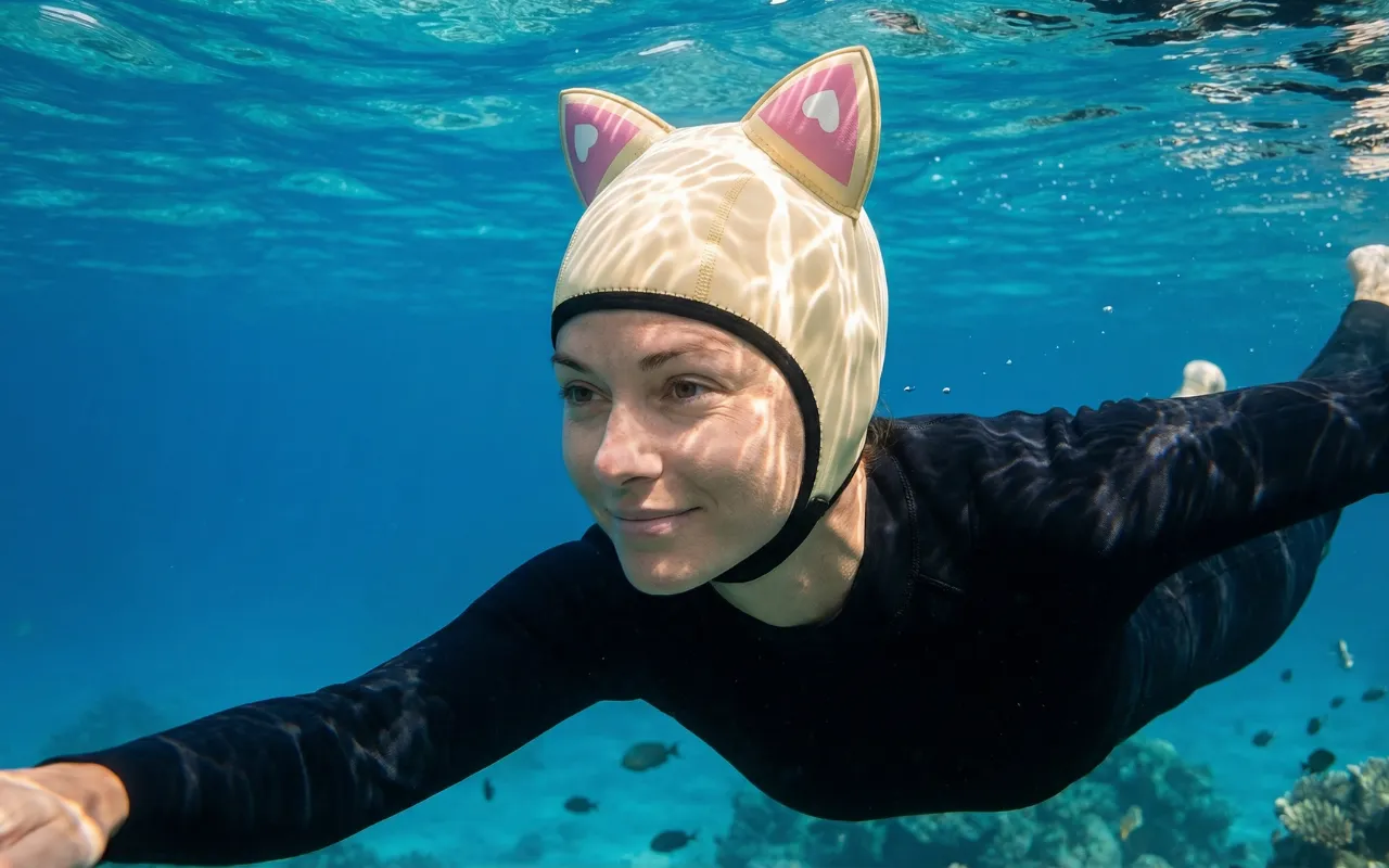 No more messy hair or cold head after diving lessons. My sister wants one too because the cat ears make it look super cool!