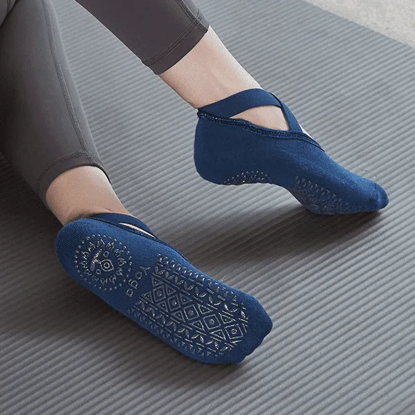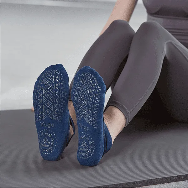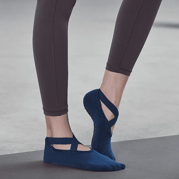Threo Yoga Socks are workout socks designed for women practicing yoga, pilates, barre, ballet, and dance. Non-slip straps and grips enhance stability during exercise, and one size fits all fitness enthusiasts. Enjoy hygiene, comfort, support, and traction barefoot.