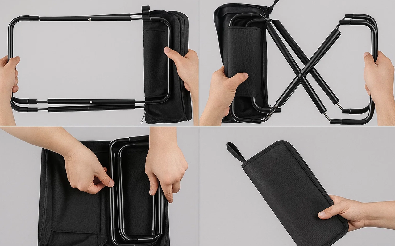 Camping is better with this folding seat. Doesn’t take up any space and holds even my big cousin. Feels super safe to sit on.